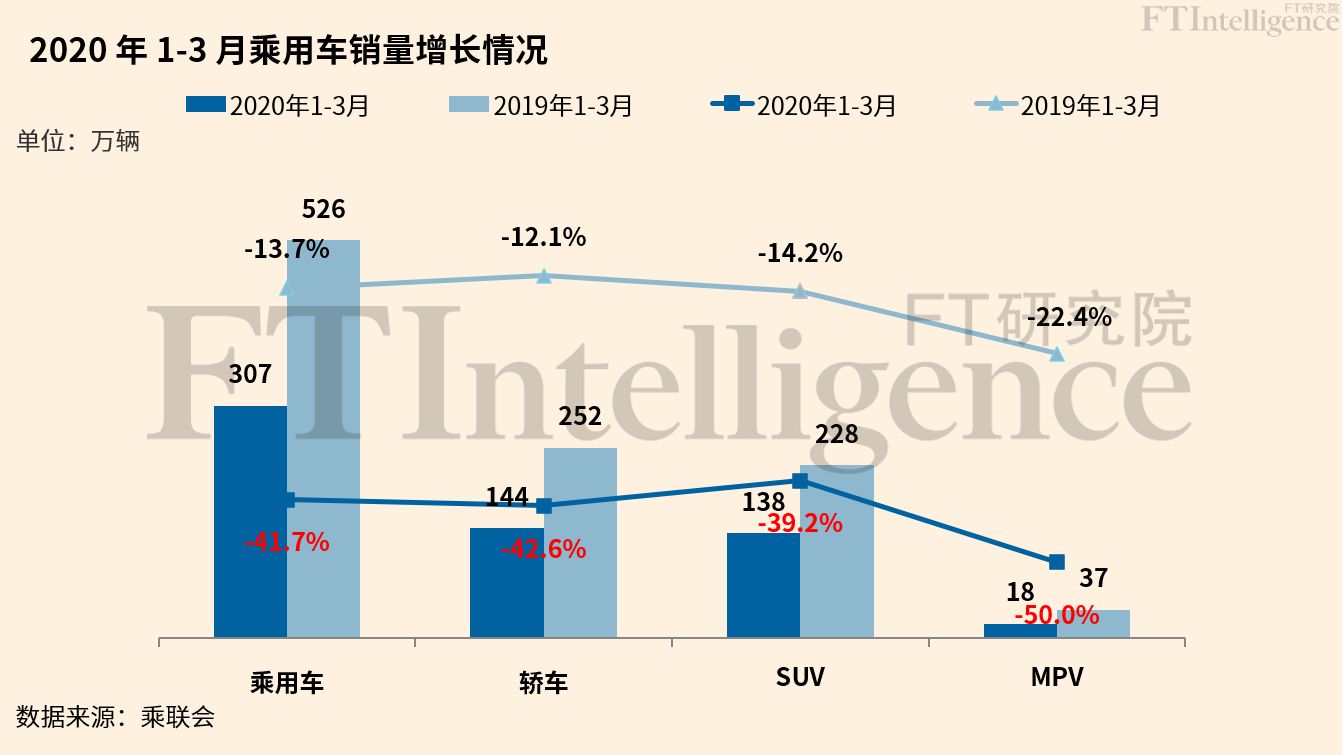 根據乘用車市場信息聯席會(簡稱:乘聯會)公布的數據,2020 年 1-3 月,中國市場的乘用車累計銷量為 307 萬輛,大幅低于去年同期 526 萬輛的銷量,同比下降 41.7%。