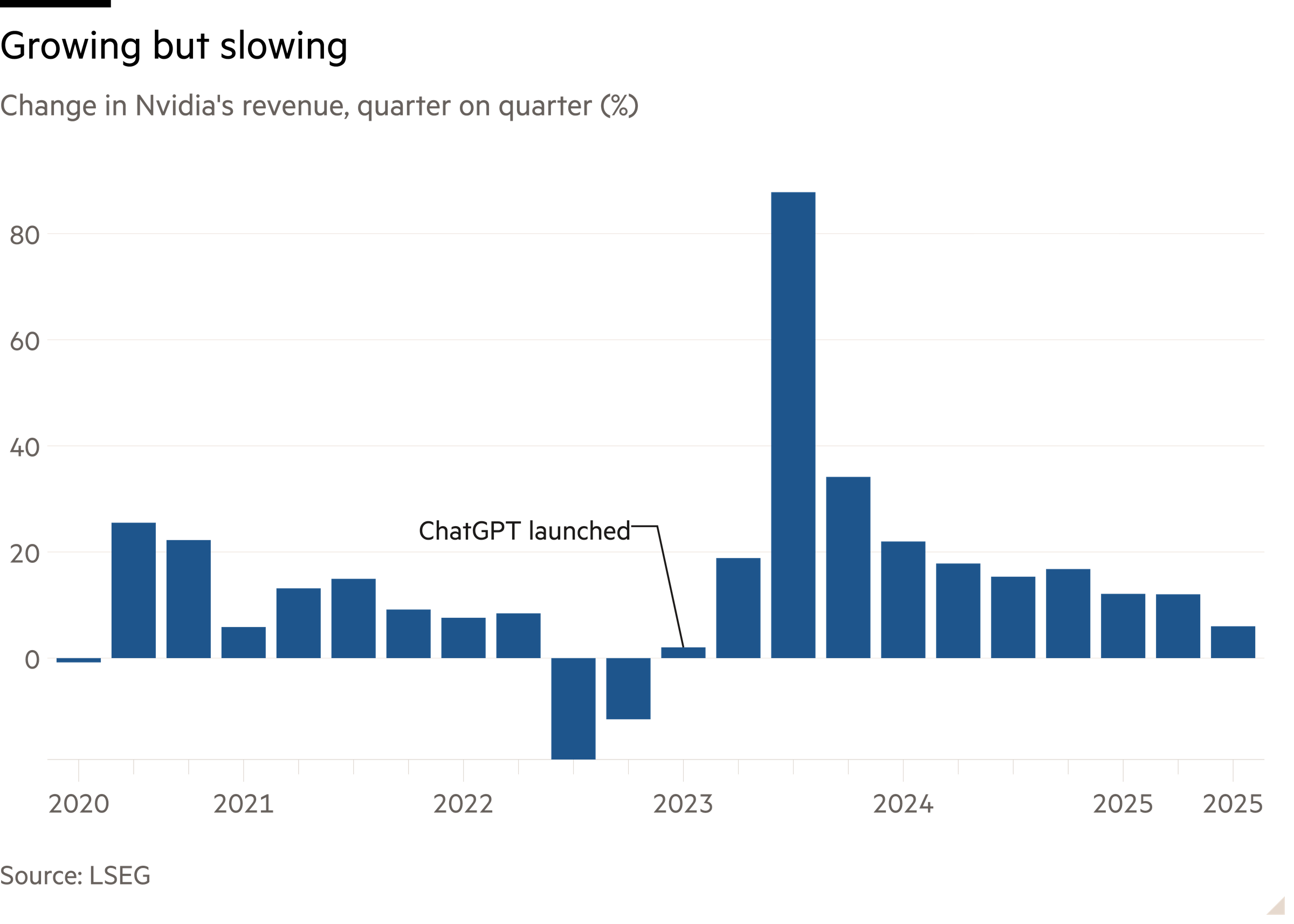 The dominant maker of chips for artificial intelligence beat estimates for both revenue and profit in its most recent financial quarter. But as Nvidia gets bigger, overachievement gets harder. Revenue of $47bn grew smartly, but at the slowest sequential rate since late 2022, when the launch of ChatGPT sparked AI mania.