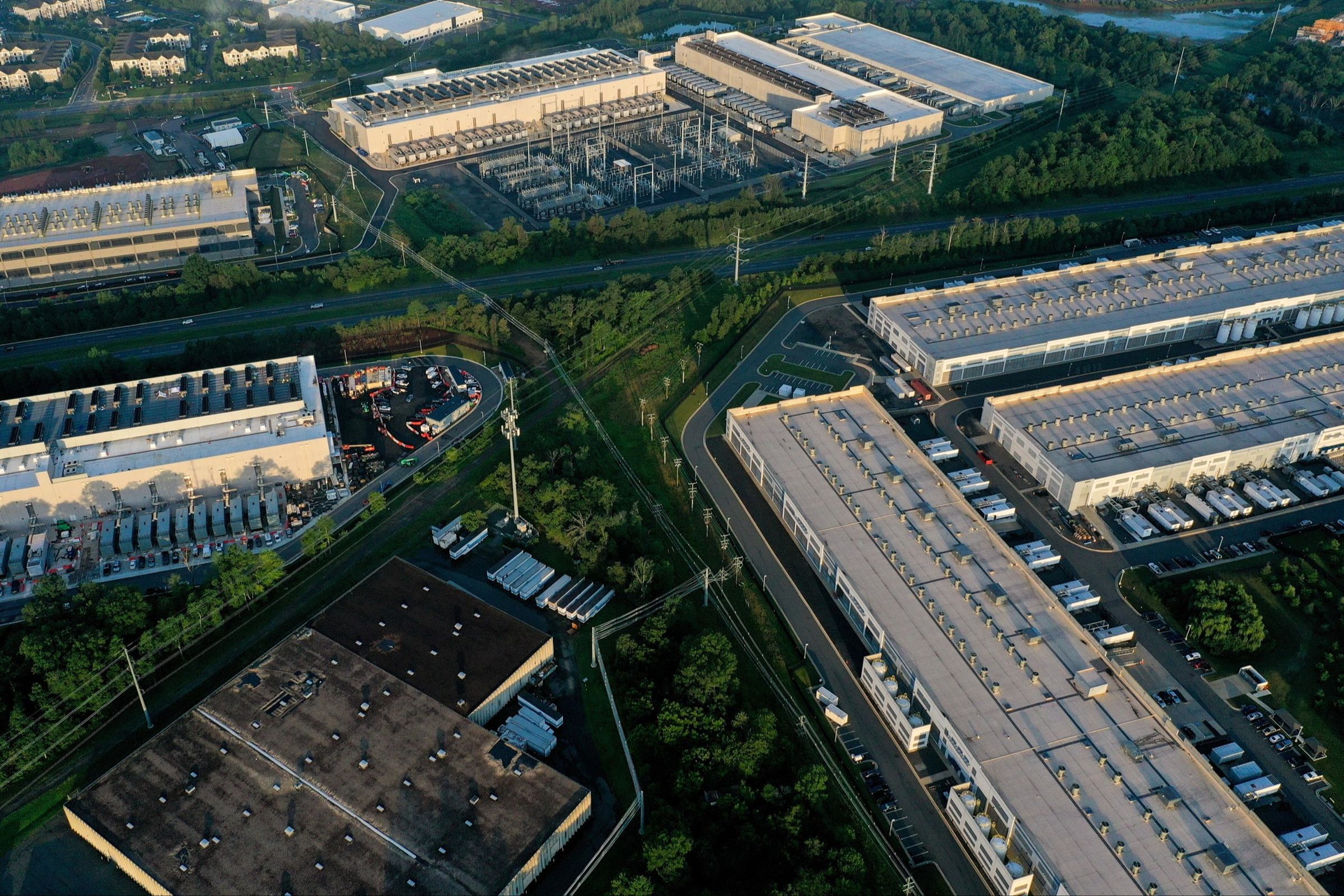 亞馬遜網絡服務(Amazon Web Services, AWS)與 Iron Mountain 數據中心的航拍圖:可見大型建筑、卡車以及電力基礎設施。