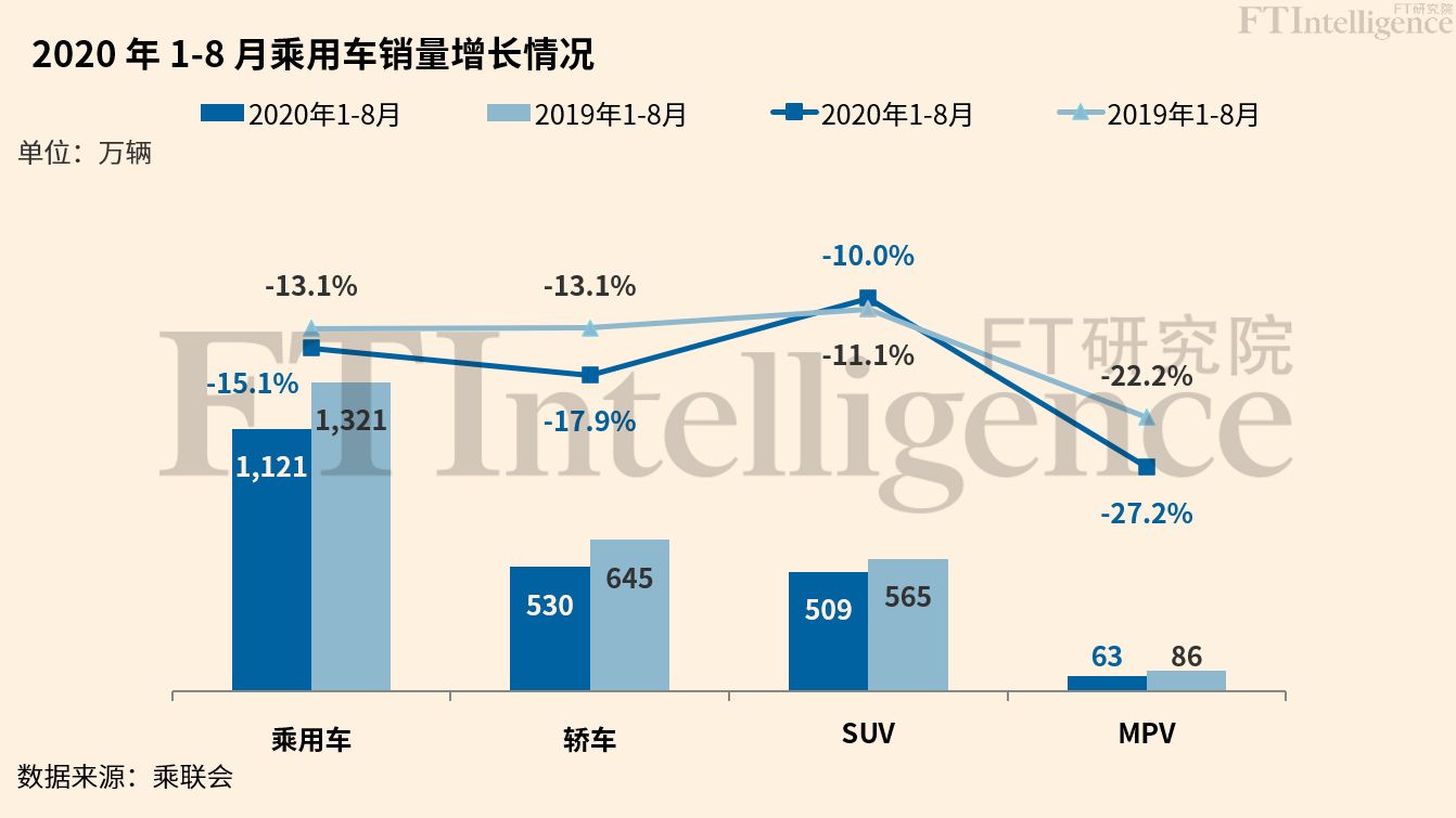 其中,轎車在 1-8 月的累計銷量為 530 萬輛,同比下降 17.9%。但轎車在去年同期的增速為 -13.1%,同比銷量也在下滑。SUV 在 1-8 月的累計銷量為 509 萬輛,同比下降 10%,好于去年同期增速 -11.1%。MPV 車型在 1-8 月的累計銷量為 63 萬輛,同比下降 27.2%。