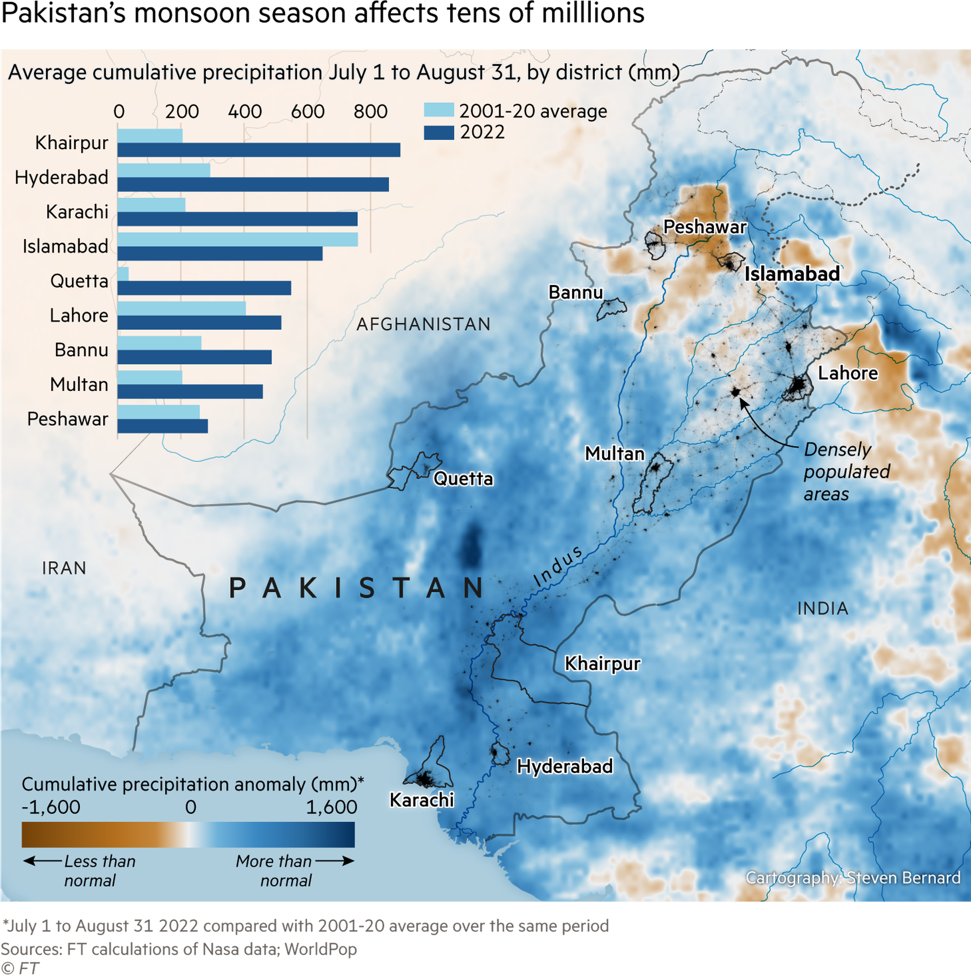 在巴基斯坦,致命的洪水摧毀了房屋,毀壞了農作物,該國官員說這是一場前所未有的氣候災難,估計有3千萬人或大約15%的人口受到影響。